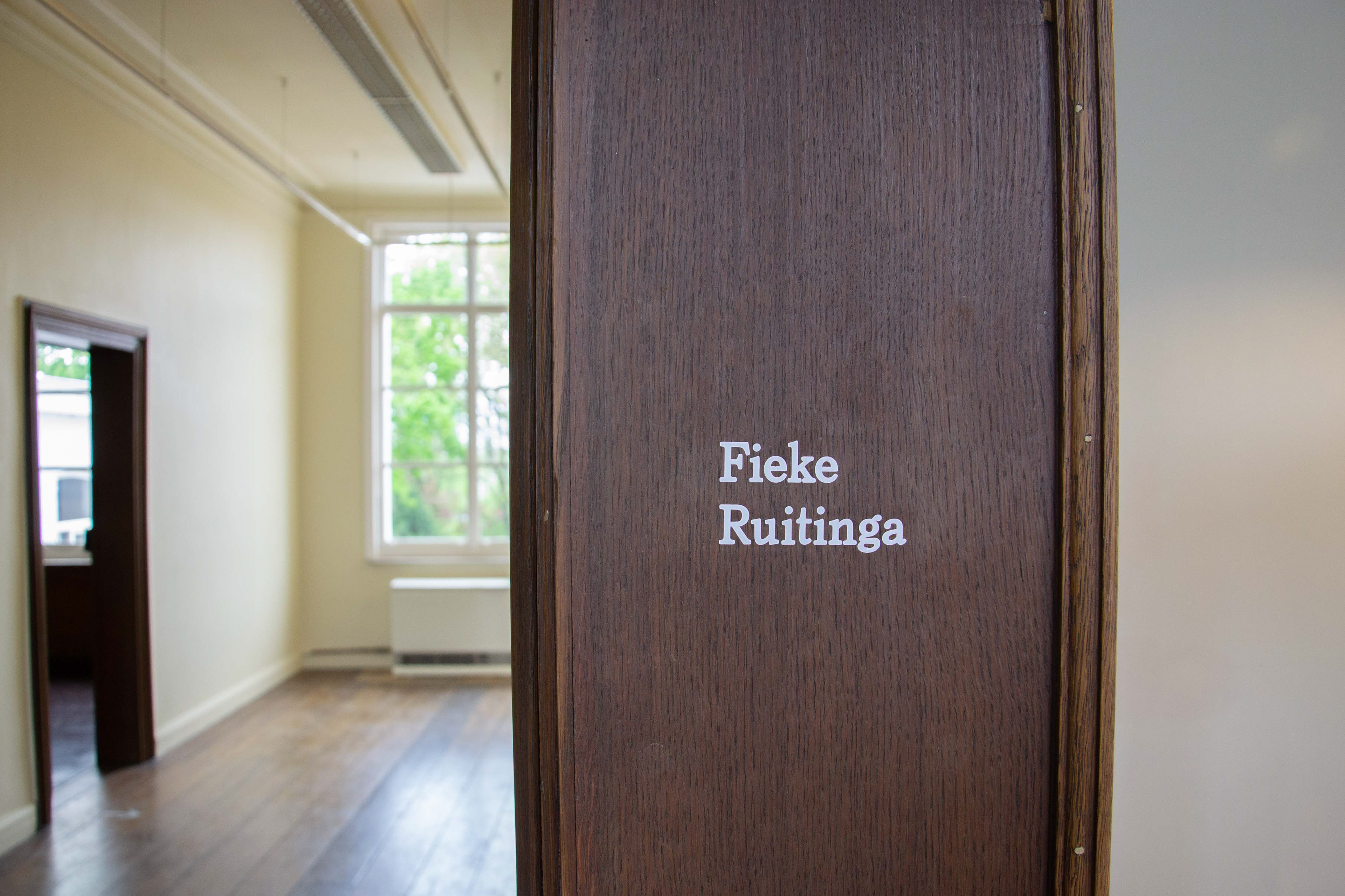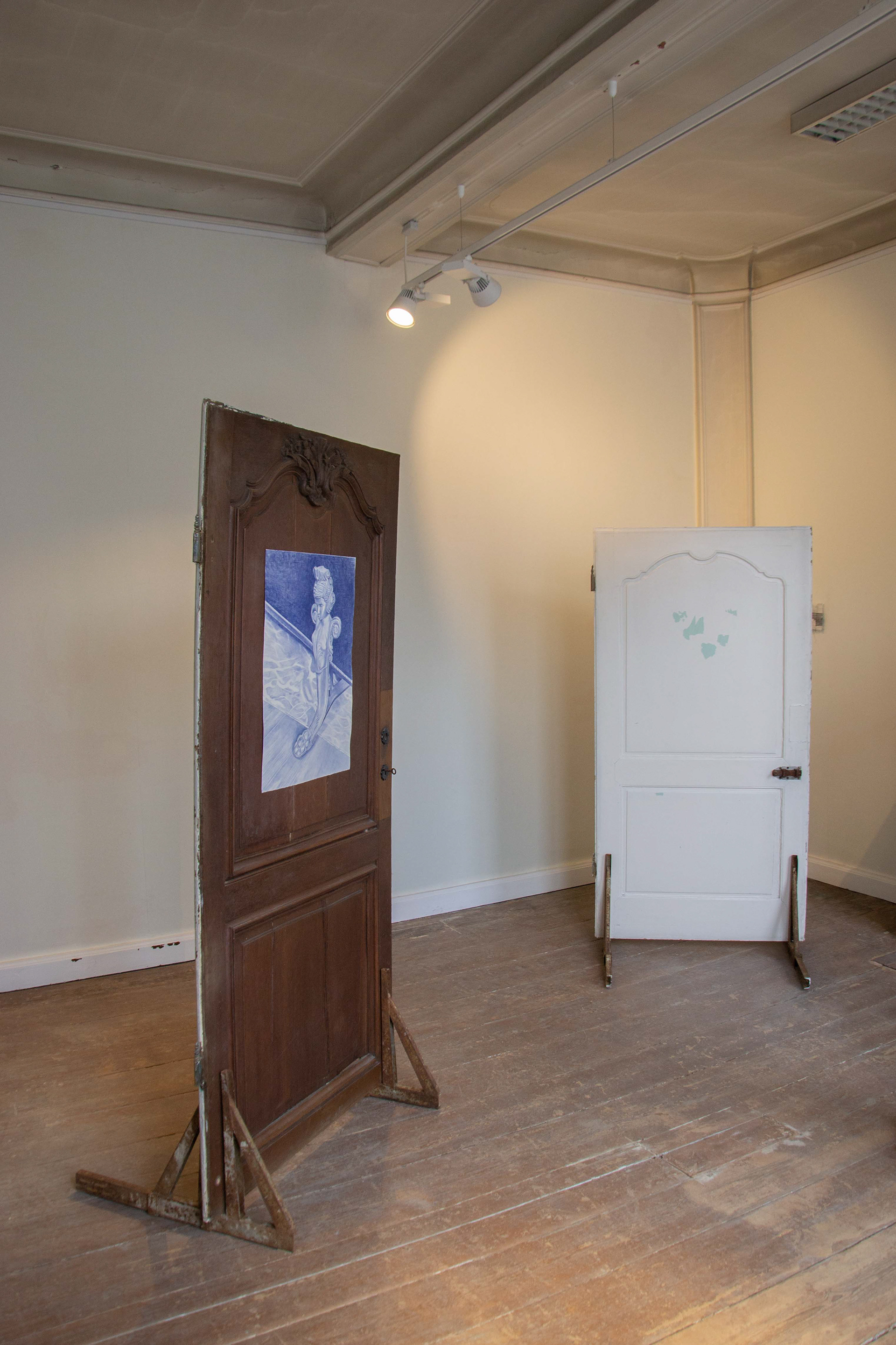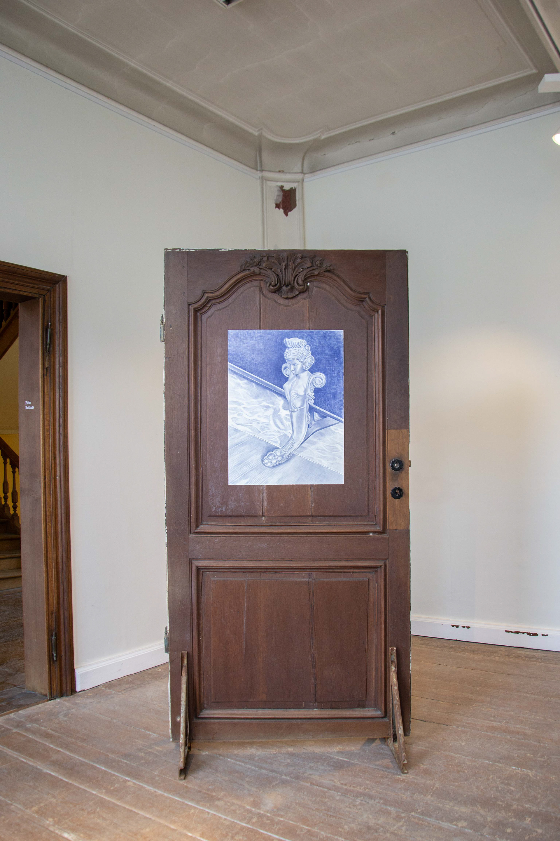 "Het werk van Fieke Ruitinga is een fysieke vertaling van haar virtuele verkenning van het Kunstenhuis. Door de gedwongen beperking van de coronamaatregelen ontdekte ze de ruimte door de ogen van anderen. In haar poging de plek zich eigen te maken, reconstrueerde ze de kenmerkende ornamenten, vloerpatronen, stoffen en handelingen tot een bijna tastbare omgeving in haar atelier en bouwde deze in het Kunstenhuis weer op. De realistische tekeningen staan in scherp contrast met haar afstandelijke werkwijze en behouden de illusie van aanwezigheid. De werken op papier zijn gemaakt met Inanthreen blauw, een synthetische kleurstof die oorspronkelijk werd ontwikkeld om de natuurlijke kleurstof Indigo te imiteren. Het diepblauwe oppervlak roept de sfeer van een droomwereld op; het Kunstenhuis blijft een vage herinnering aan een plek waar ze nooit geweest is."