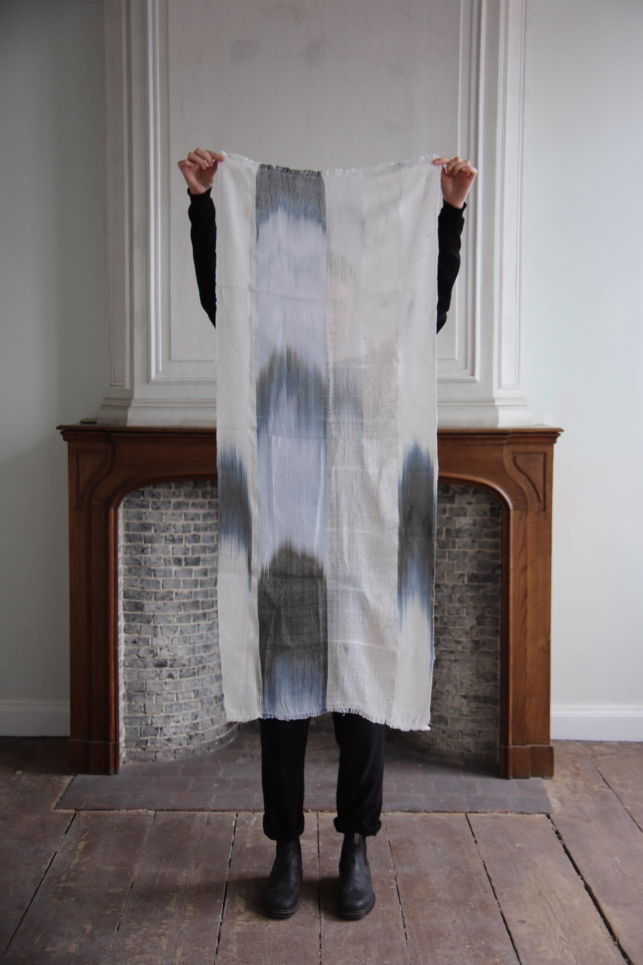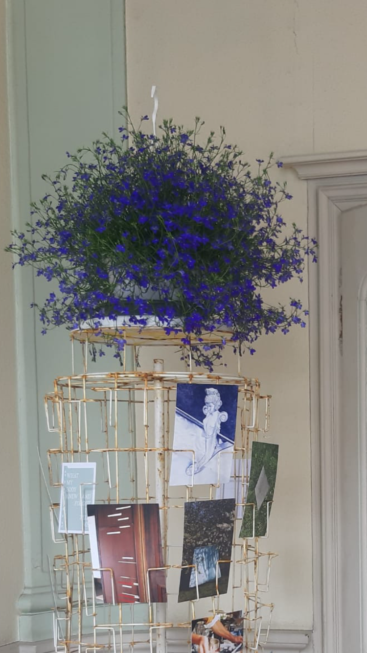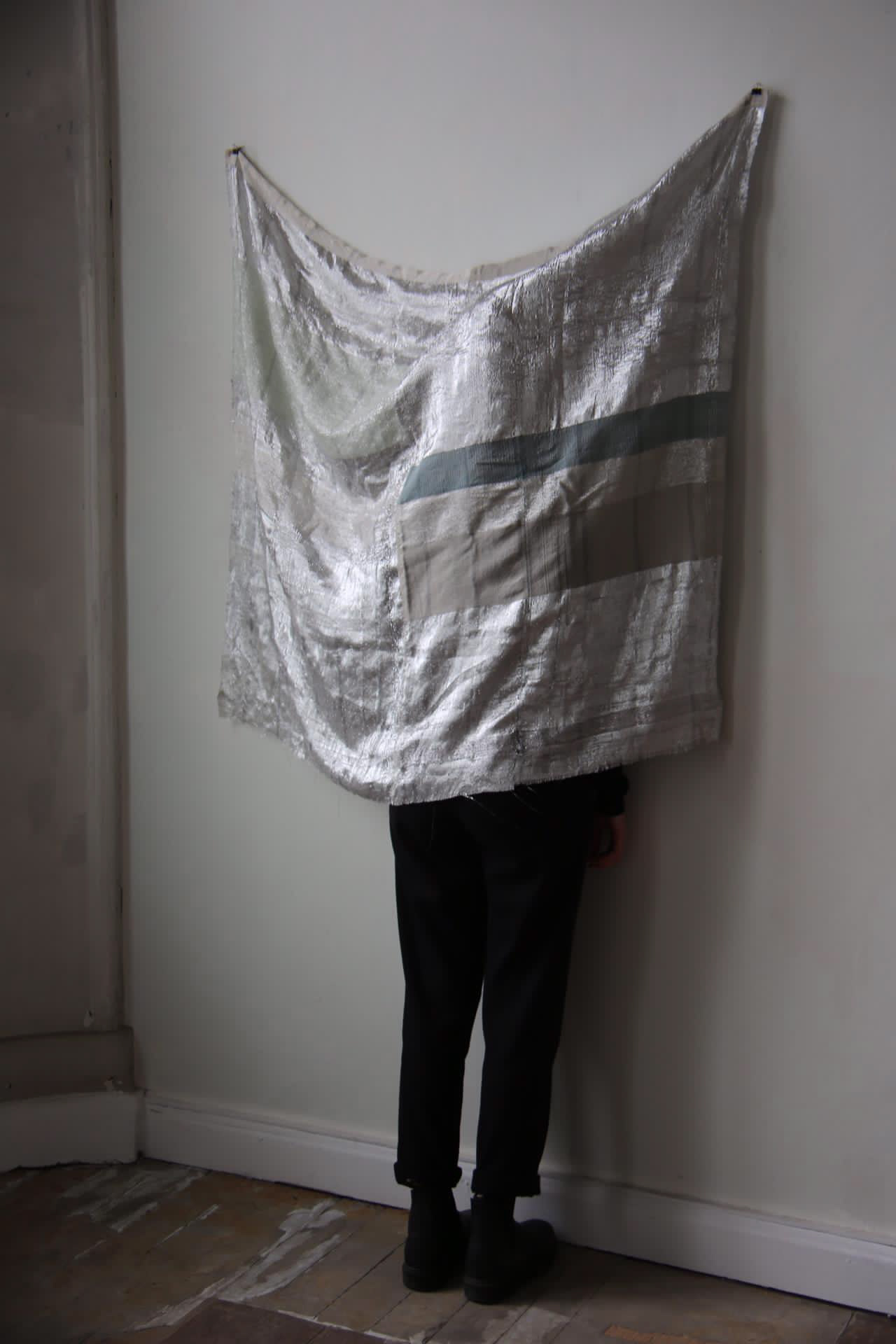 "Het werk van Fieke Ruitinga is een fysieke vertaling van haar virtuele verkenning van het Kunstenhuis. Door de gedwongen beperking van de coronamaatregelen ontdekte ze de ruimte door de ogen van anderen. In haar poging de plek zich eigen te maken, reconstrueerde ze de kenmerkende ornamenten, vloerpatronen, stoffen en handelingen tot een bijna tastbare omgeving in haar atelier en bouwde deze in het Kunstenhuis weer op. De realistische tekeningen staan in scherp contrast met haar afstandelijke werkwijze en behouden de illusie van aanwezigheid. De werken op papier zijn gemaakt met Inanthreen blauw, een synthetische kleurstof die oorspronkelijk werd ontwikkeld om de natuurlijke kleurstof Indigo te imiteren. Het diepblauwe oppervlak roept de sfeer van een droomwereld op; het Kunstenhuis blijft een vage herinnering aan een plek waar ze nooit geweest is."